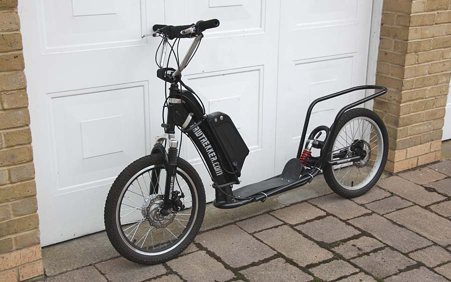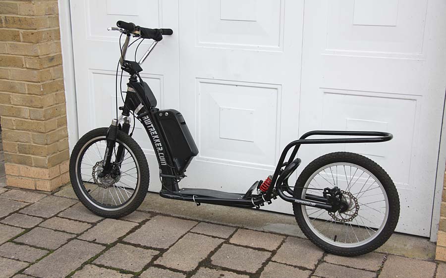 | My recent conversion of a 20-inch-wheel, full-suspension - Pawtrekker Dog Scooter - to convert it to an Electric Cargo Scooter. The 250 watt Electric front-wheel kit was purchased from - Cyclotricity - as I know their kits are reliable and very good value-for-money, as I converted my GT Mountain Bike a couple of years ago, and I have also helped others to fit Cyclotricity kits in Bristol. This is the Pawtrekker Dog Scooter in its 'normal' mode, except that I've removed the front dog-pulling towing bar extension for ease of fitting it into my car. |